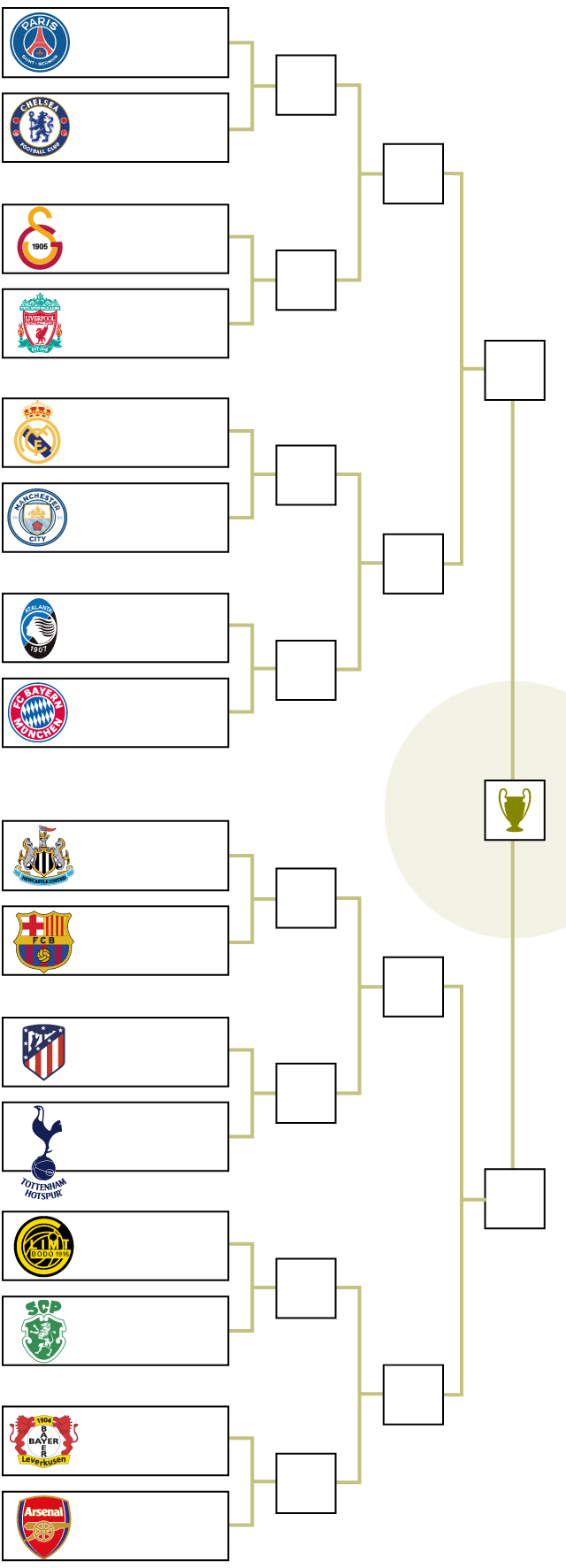 Pel que fa a uns hipotètics quarts de final, el Barça s'enfrontaria al vencedor de l'Atlètic de Madrid-Tottenham amb l'anada al Camp Nou, mentre que els d'Álvaro Arbeloa –en cas de guanyar al Manchester City– jugarien davant l'Atalanta o el Bayern de Múnic. L'equip de Hansi Flick, a més, s'estalvia el Reial Madrid, el Manchester City, el Liverpool, el PSG i el Bayern de Múnic fins a la final, tot i que podria trobar-se l'Arsenal a les semifinals. Els quarts de final seran el 7/8 i el 14/15 d'abril, mentre que les semifinals es jugaran el 28 o 29 d'abril i el 5 o 6 de maig, dia en què quedarà definida la final. El Barça jugaria l'anada al Camp Nou en totes dues eliminatòries.