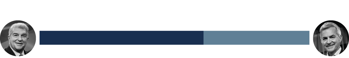 Després de cinc anys de mandat, Laporta assoleix el seu millor resultat a les urnes: el 2003 va obtenir 27.138 vots, mentre que el 2021 es va imposar amb 30.184 suports. Lluny queden els 15.615 vots de la punxada del 2015 –any en què va guanyar Josep Maria Bartomeu–, l’única vegada que ha resultat perdedor en uns comicis. Per la seva banda, Víctor Font empitjora el suport rebut ara fa cinc anys, quan 16.679 socis li van fer confiança. Llavors, el candidat va aconseguir un percentatge de suport molt similar al d’enguany i va treure un 29,99% dels vots. Esclar que en les eleccions del 2021 hi havia un tercer home, Toni Freixa, que va aplegar 4.769 vots (8,58%).