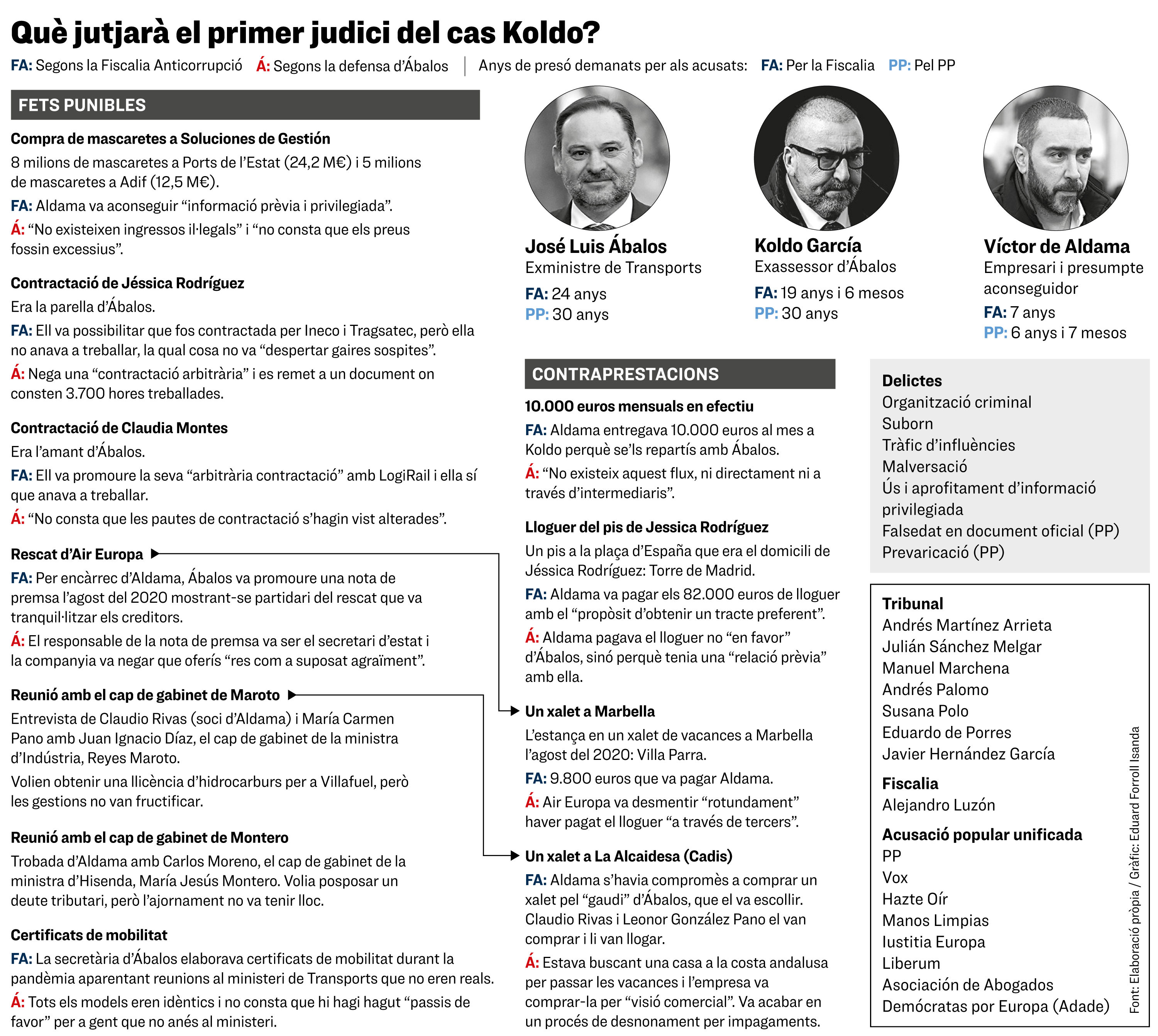 Madrid“Un acord que tenia per objecte la futura comissió de delictes a mesura que s’anessin presentant les oportunitats de cometre’ls”. Després d’un any i mig d’investigació, així és com va resumir el jutge Leopoldo Puente l’operativa que ha dut José Luis Ábalos, Koldo García i Víctor de Aldama al banc dels acusats. L’aleshores ministre es valia de la seva “valuosa influència”, l'assessor aprofitava els seus “oficis” i l’empresari i presumpte facilitador buscava empreses o particulars que volguessin fer gestions amb l’administració per fer valdre els seus interessos de manera “arbitrària”. Tot plegat, segons la Fiscalia Anticorrupció, a canvi del “pagament continuat de quantitats de diners elevades” en el marc d’un “conveni criminal”. I aquesta setmana el Tribunal Suprem dona el tret de sortida al judici, que serà el primer relacionat amb el cas Koldo –hi ha altres branques investigades a l’Audiència Nacional, com les adjudicacions d’obres públiques que esquitxen Santos Cerdán–. Qui va ser ministre de Transports, secretari d’organització del PSOE i home de la màxima confiança de Pedro Sánchez està a la presó de Soto del Real des de finals de novembre, va renunciar a l’acta de diputat fa dos mesos i ara s’enfronta a entre 24 i 30 anys de presó. A sobre la taula hi haurà nou delictes, entre els quals destaquen els de pertinença a organització criminal, suborn, tràfic d’influències i malversació.