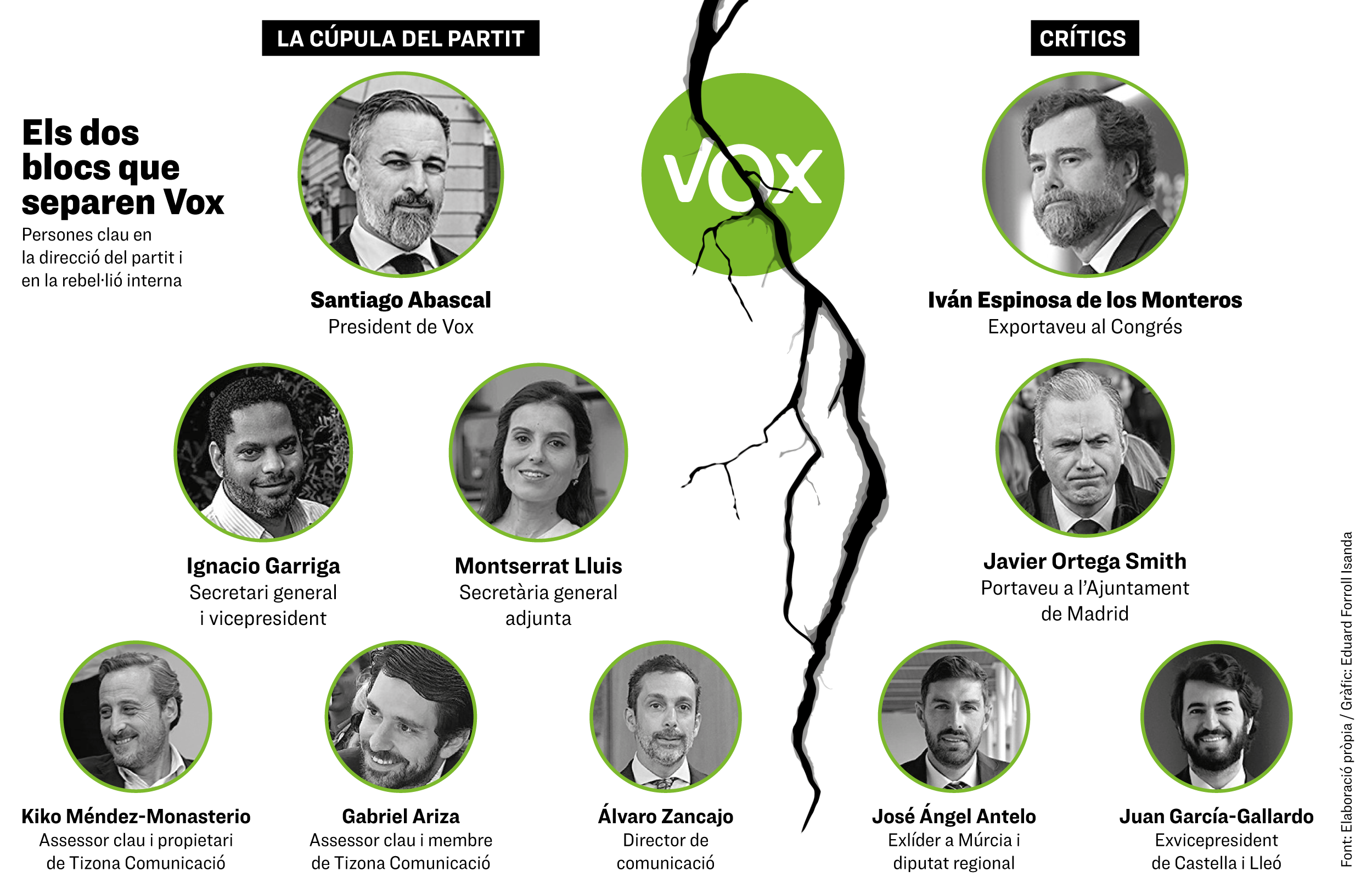 A Vox hi ha un nucli de poder encapçalat per Abascal com a president, Ignacio Garriga com a secretari general i vicepresident, i Montserrat Lluis com a adjunta a la secretaria general. Com a persones de confiança també hi ha els assessors en comunicació Kiko Méndez-Monasterio i Gabriel Ariza –fill del tòtem de la comunicació que lidera El Toro TV, Julio Ariza–, que tenen l'empresa Tizona; a més del director de comunicació, Álvaro Zancajo. Sense ells no es mou res al partit. La guerra, sostenen fonts de Vox, ve per "qui està més a prop del líder i qui no". La trencadissa ha arribat a fer sospitar que "estan fent un nou partit amb l'excusa del congrés extraordinari". Gallardo va defensar crear-ne un en una entrevista a El Mundo "si Vox deixa de ser útil". Però no queda clar que Espinosa faci el pas per la divisió que causaria.