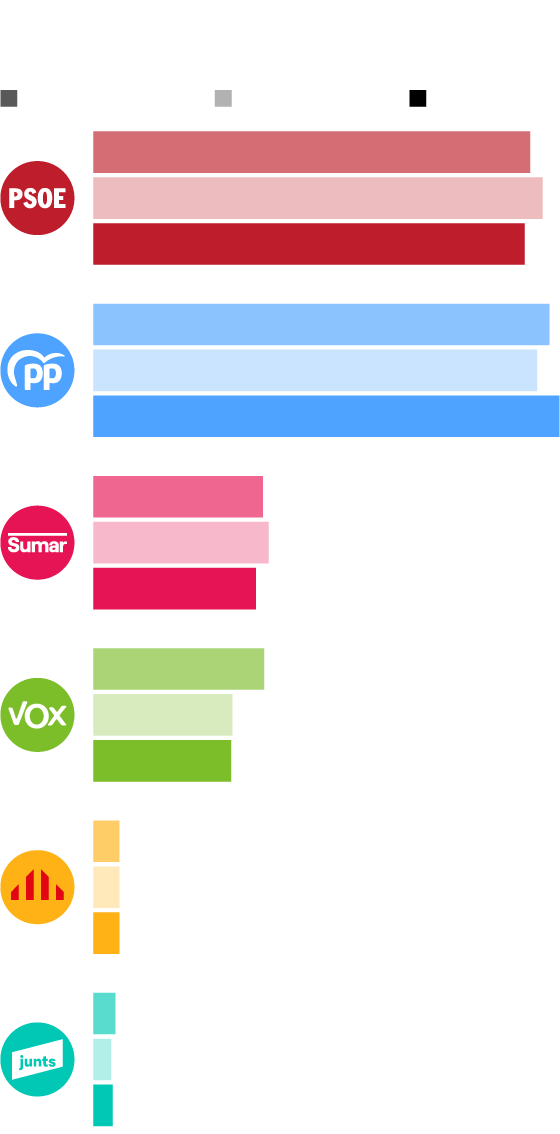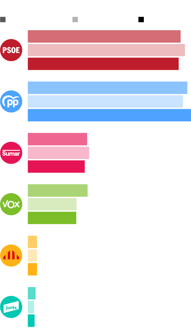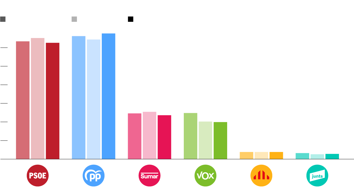 En comparació amb l'octubre, doncs, els socialistes perden 1,3 punts i els conservadors en guanyen 1,7. L'avantatge que el PP li trauria al PSOE és de 2,6 punts i això no s'havia vist en les enquestes del CIS. Al juliol, José Félix Tezanos només va dibuixar un marge de quatre dècimes de Feijóo sobre Sánchez. Per darrere, Sumar també veuria reduït el seu suport i passaria del 12,7% de l'octubre a un 11,8%; mentre que Vox només cauria una dècima i se situa al 10%. Pel que fa als independentistes, ERC manté l'1,9% dels sufragis i Junts passa de l'1,3% a l'1,4%.