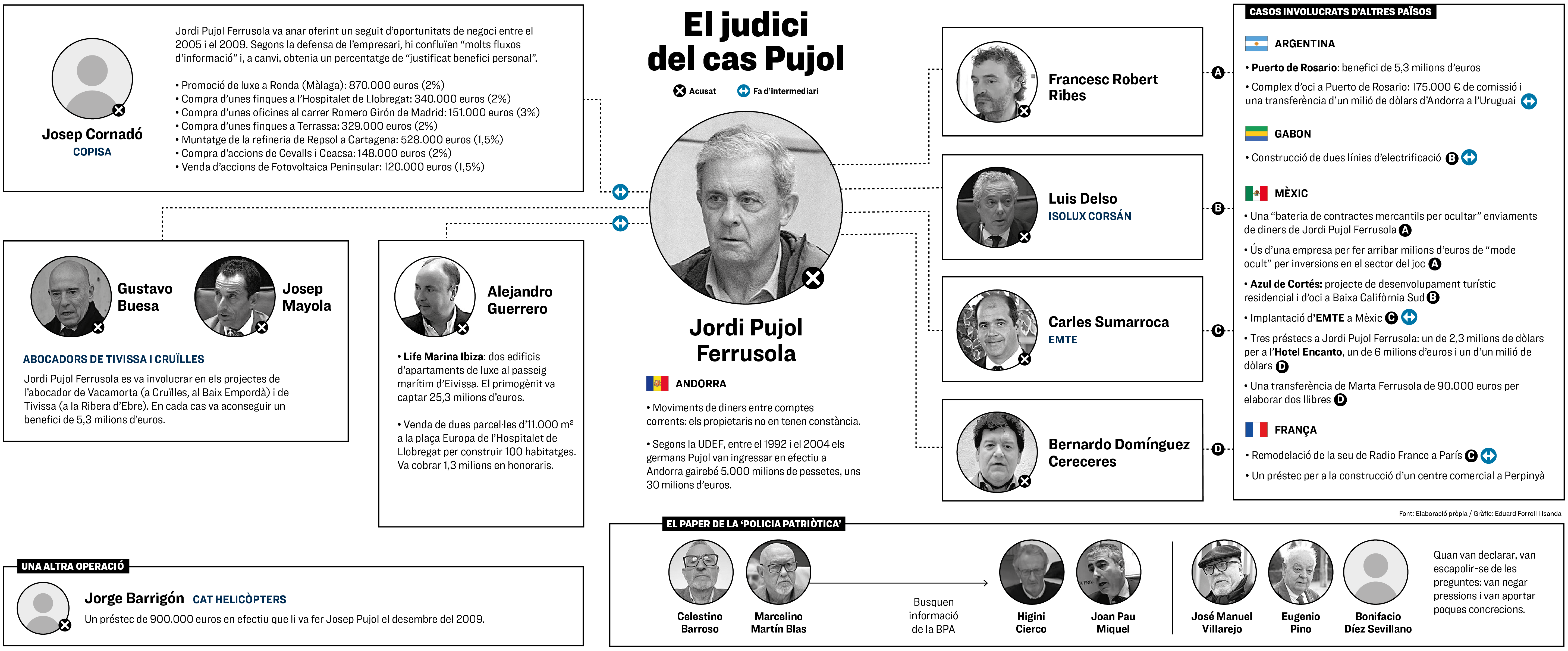MadridLa fortuna dels Pujol a Andorra provenia de la famosa deixa de l’avi Florenci o de comissions il·legals a canvi de favors polítics? És la gran qüestió que intenta dilucidar-se en un judici que ja porta 24 sessions i que ha fet desfilar fins ara per l'Audiència Nacional 200 testimonis. Els interrogatoris, amb problemes tècnics recurrents i repetits buits de memòria, estan versant especialment sobre les operacions que va protagonitzar Jordi Pujol Ferrusola, que s’enfronta a 29 anys de presó per cinc delictes. Molts testimonis han acreditat el paper del fill gran com a intermediari: ell oferia "moltes oportunitats de negoci" a empresaris –tot eren relacions entre privats– i, a canvi, rebia una contraprestació si el projecte acabava reeixint. Ara bé, la Fiscalia Anticorrupció creu que els moviments de diners servien per emmascarar comissions que responien a una "xarxa de clientelisme" que havia teixit el seu pare des de la Generalitat. De moment, durant el judici, aquest favoritisme no ha quedat acreditat.