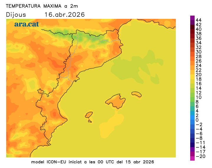 Tant divendres com el cap de setmana els termòmetres encara s’enfilaran més, amb calor accentuada i valors més propis del maig que no pas de l’abril. Moltes màximes es mouran entre els 24 i els 28 al prelitoral i a l’interior, i fins i tot es poden fregar o assolir localment els 30 °C en punts de Ponent i de l’interior de l’Ebre. Més suavitat a la costa, on també se superaran els 20 °C.