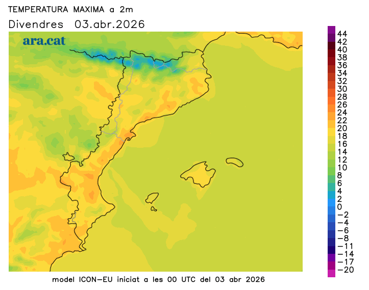 El temps serà molt plàcid amb sol radiant el Dilluns de Pasqua, amb unes temperatures que ens recordaran més als valors del mes de maig que no pas de principis d’abril. S’esperen moltes màximes de 20 °C a 25 °C, però en punts del prelitoral i de l’interior s’acabaran superant aquestes xifres i es fregaran localment els 30 °C a Ponent i a l’interior de l’Ebre. Els termòmetres quedaran més frenats a la costa per la influència del mar, que encara està fred.