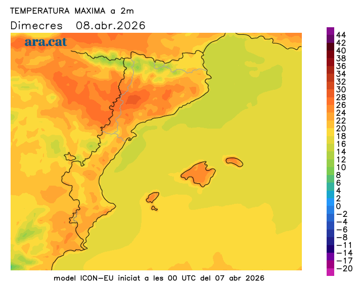 Les temperatures pujaran més aquest dimecres, tant les mínimes com les màximes. Fred molt moderat o fresca a primera hora, i ambient càlid al migdia, amb moltes màximes de 24 ºC a 28 ºC, tot i que localment es fregaran els 30 ºC al sud i a Ponent. Termòmetres més frenats a la costa per l’efecte regulador d’un mar encara força fred. El contrast entre l’aigua marítima fresca i la bonança ambiental afavorirà l’aparició d’algunes boires o núvols baixos en trams costaners.
