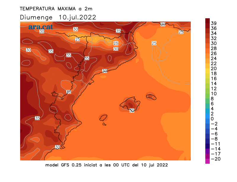També sembla clar que la calor de primera categoria ens acompanyarà durant els pròxims deu dies. Els models meteorològics han intensificat la calorada i han desplaçat el seu punt àlgid de mitjans de la setmana vinent al proper cap de setmana. Demà dilluns les temperatures seran semblants a les d'avui i fins i tot podrien recular un pèl a les comarques gironines. Dimarts, però, ja notarem 2 o 3 graus més que avui a Ponent i de cara a dimecres es superaran els 40 ºC als sectors més càlids del país.